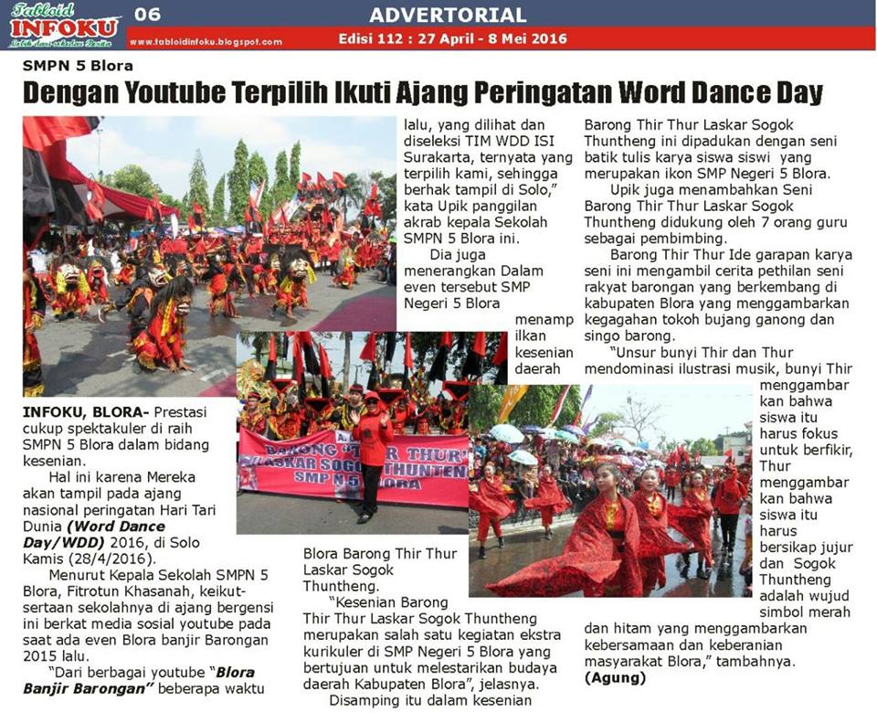 Dengan memadukan seni barongan dan seni batik, group Barong Thir Thur Laskar Sogok Thuntheng SMPN 5 Blora siap tampil memeriahkan Word Dance Day di Surakarta pada tanggal 28-29 April 2016, dengan jumlah personil 72 siswa-siswi dan 7 orang guru sebagai pendamping. Momen ini telah dipublikasikan lewat media cetak.